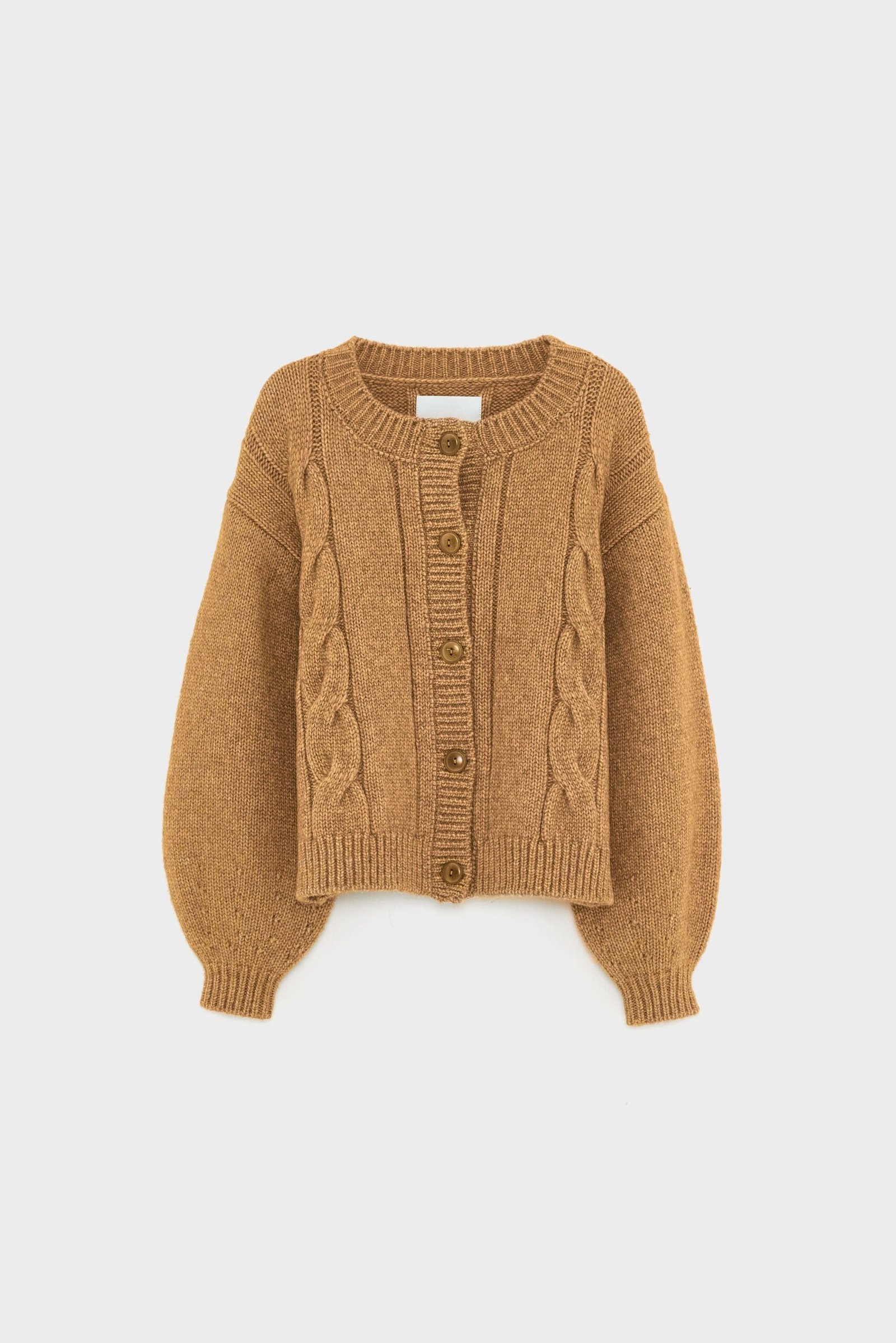 Chunky button up cardigan in light brown with cable knit details on the front.