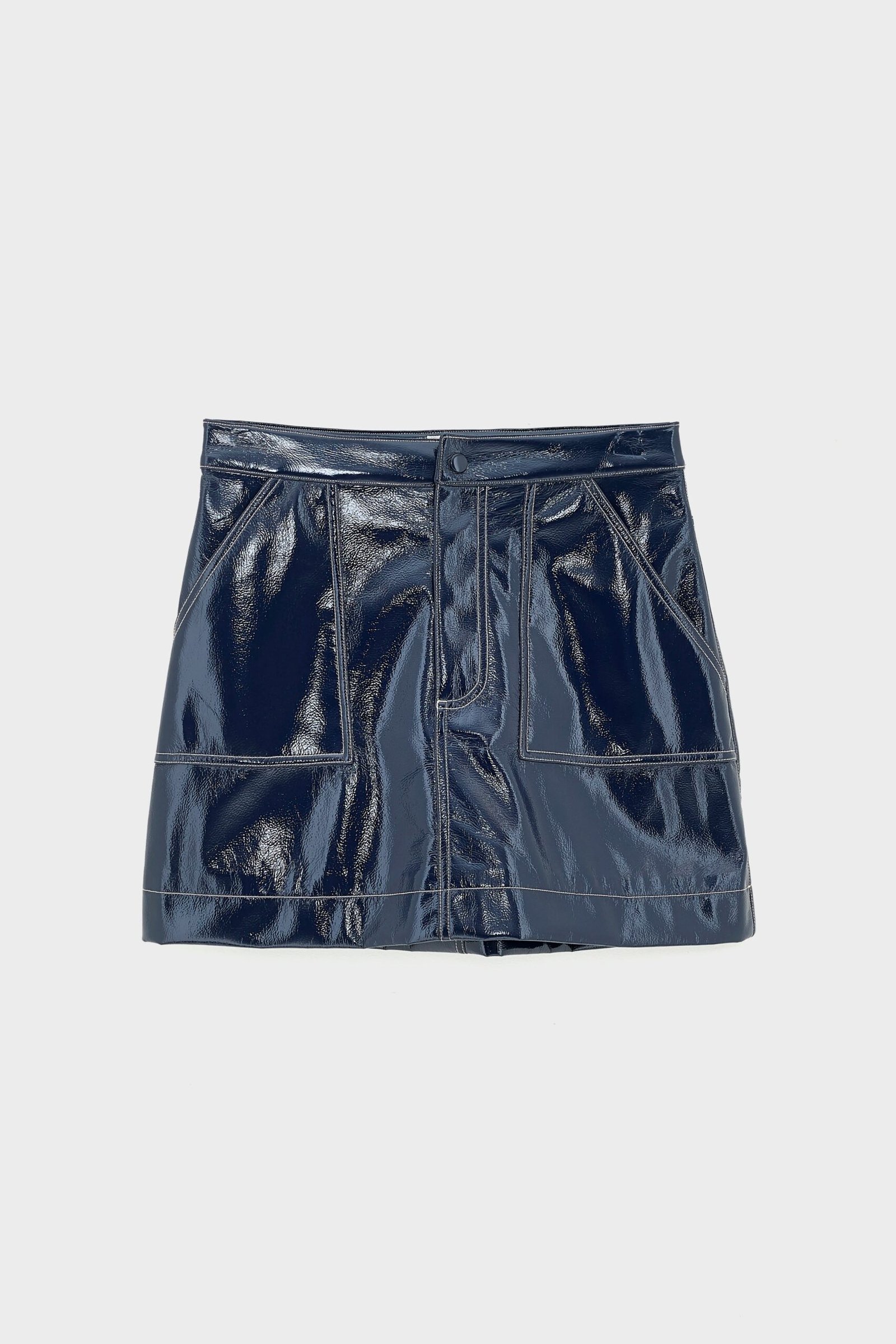 Faux-leather mini skirt with an A-line shape and side patch pockets made from vinyl-like fabric in navy blue.